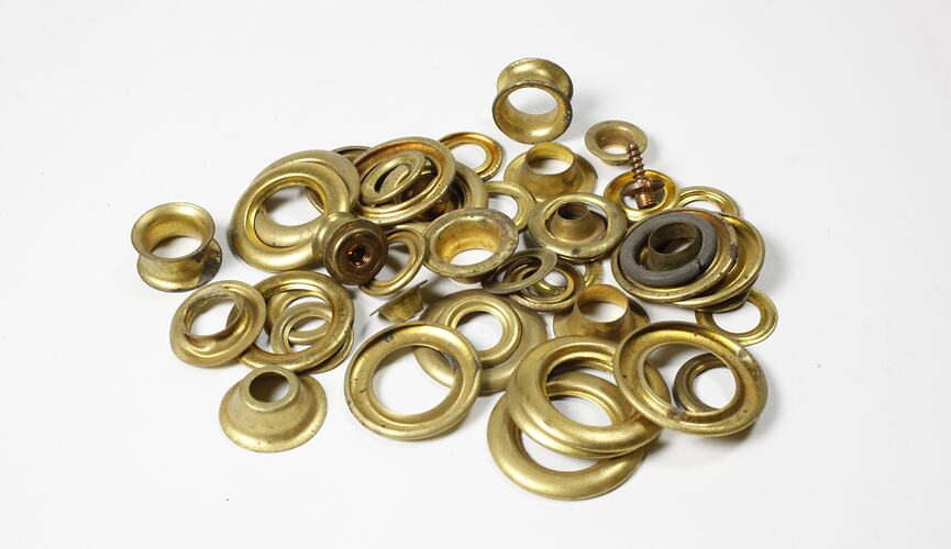 52 metal, possibly brass, grommets of various sizes.