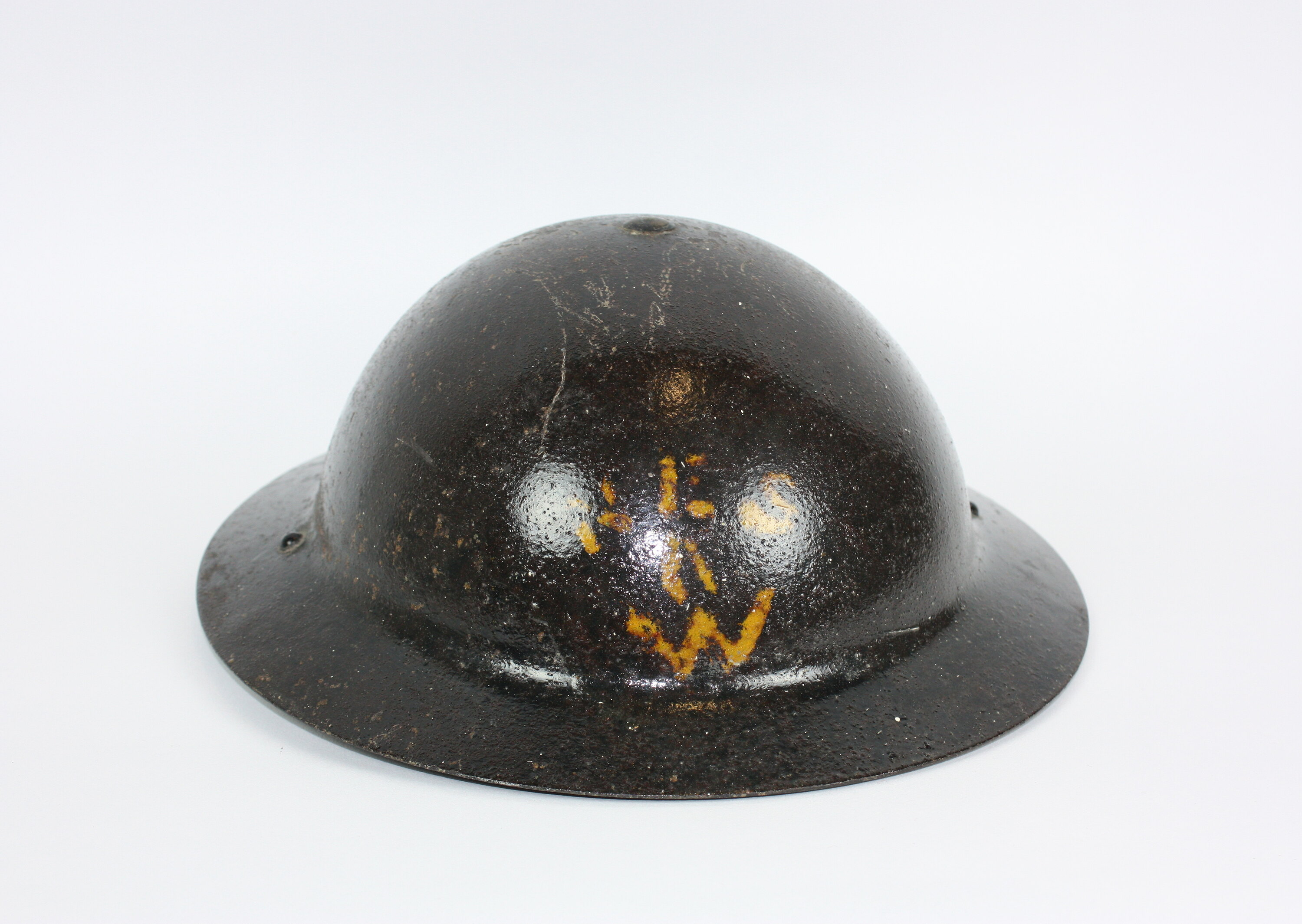 Metal helmet, probably steel, with brim around, varnished or painted, with yellow stencil on front. Inside helmet is a metal and leather structure which would fit closely to the head of the wearer, protecting them from impact. An elasticized chin strap is fastened at each side.