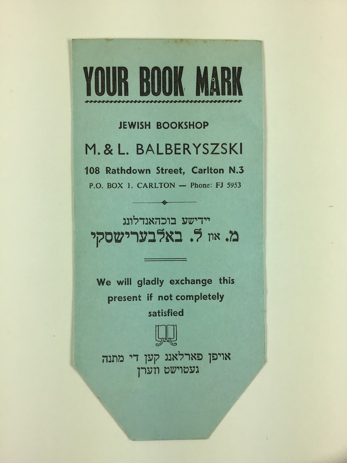 'YOUR BOOK MARK/JEWISH BOOKSHOP/M.&L. BALBERYSZSKI/108 Rathdown(sic) Street, Carlton...'