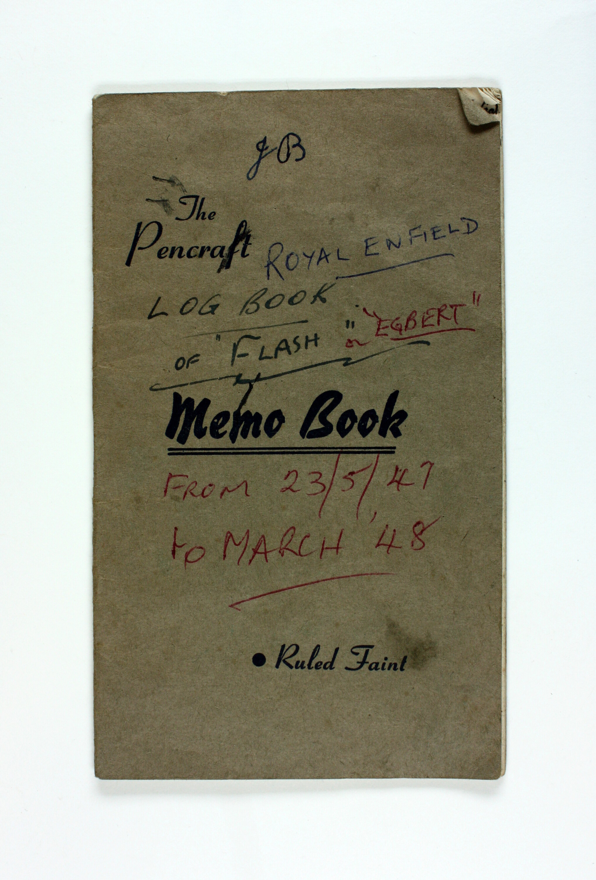 Printed on front: 'The / Pencraft / Memo Book / . Ruled Faint'. Hand-written on front, in different inks: 'JB / ROYAL ENFIELD / LOG BOOK / of "FLASH" or "EGBERT" / FROM 23/5/47 / to MARCH '48'.