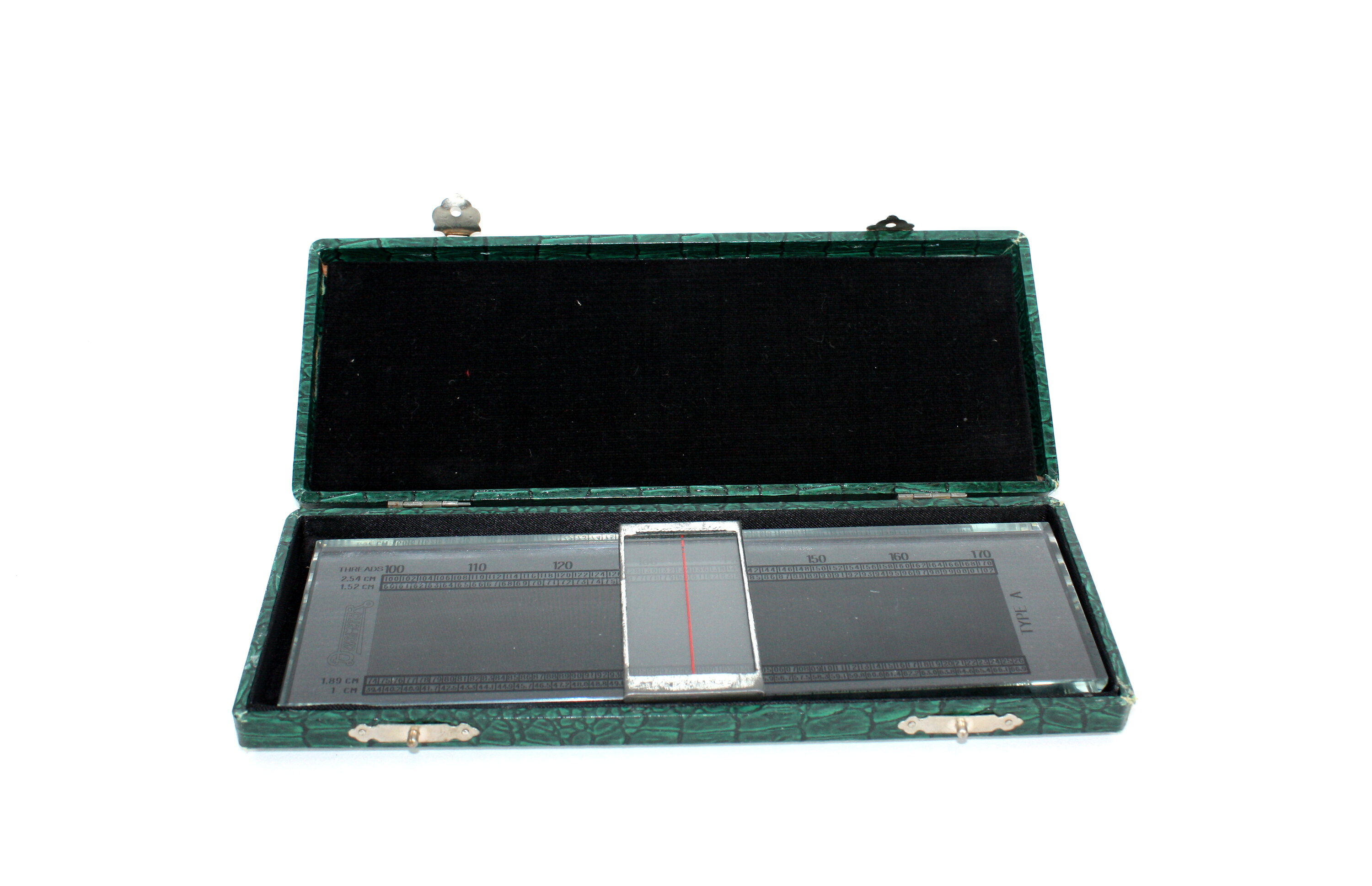 Hinged rectangular box, covered with green paper and lined with black fabric. Contains a rectangular densimeter with thick glass body, printed in black with scales (in centimetres) along top and bottom, 100-170 (denier), and fine vertical lines between. A glass tab with a red vertical line, framed in metal, slides along the surface of the main body to facilitate the measurement.