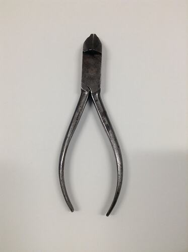 Metal pliers with tapering handles. The cutting edge is diagonal, and the nose of the pliers is short and square. The metal is uncoloured, and shows some signs of tarnishing. Overall the pliers show signs of use.
