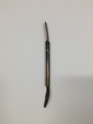 Handmade tool used for etching or engraving. Made from brass that was used by George Kyriakides in the production of jewellery. This tool is difficult to classify as it has no makers marks. The finish on the piece is rough and there are signs of hard use. This tool was used by George Kyriakides as part of the collection of tools used in his jewellery-making trade between 1949 and 2006.