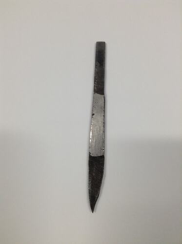 Long metal tool. Possibly used for engraving. Flat at one end, and tapers to a flat point at the other. Used for jewellery making.