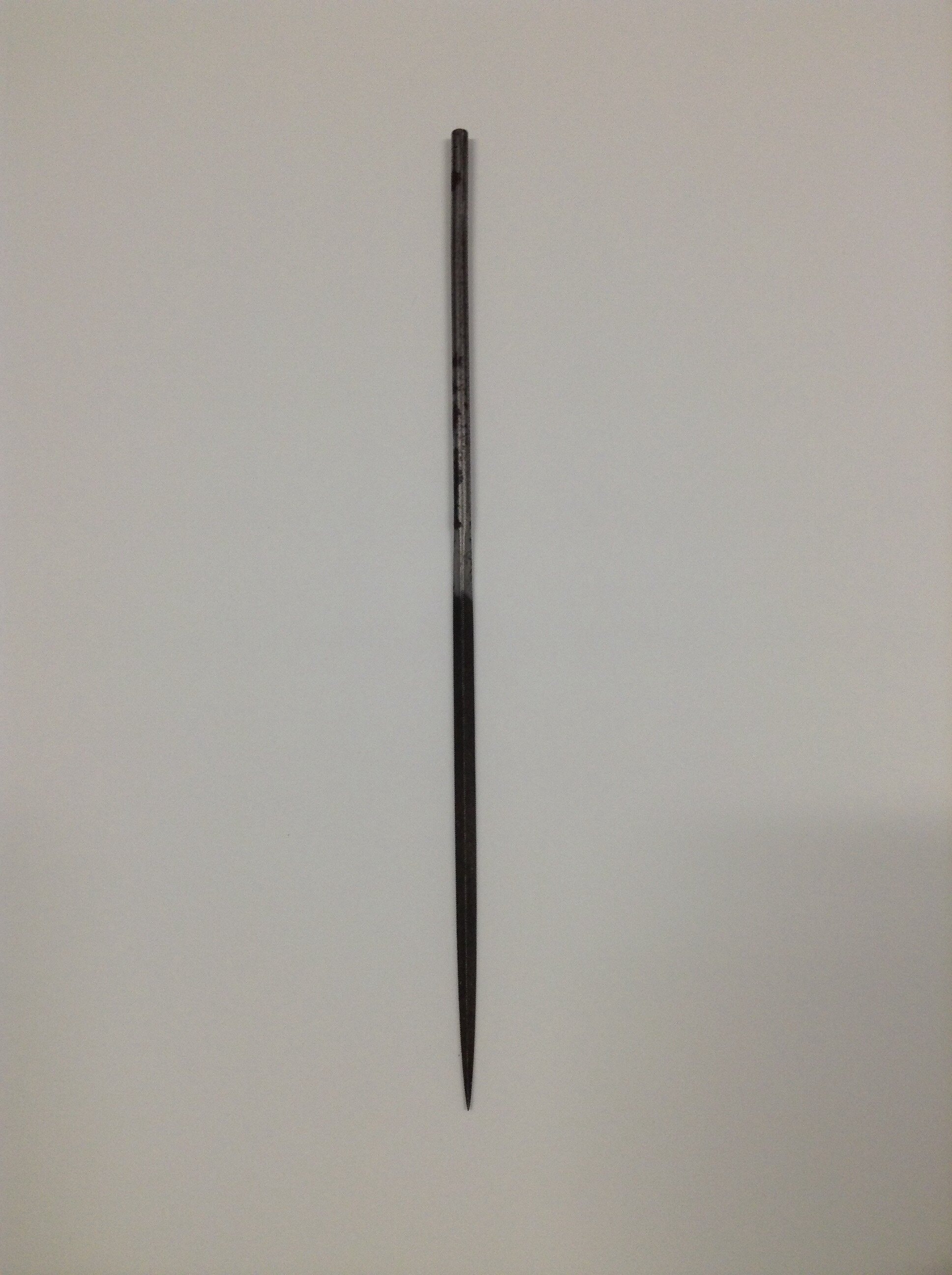 Long thin cylindrical metal file. File is triangular in shape, and tapers to a fine point. Used for jewellery making.