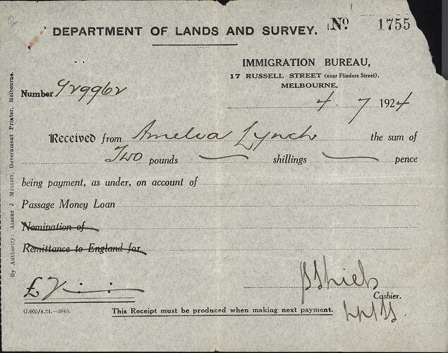 "DEPARTMENT OF LANDS AND SURVEY. No. 1755./ IMMIGRATION BUREAU,/ 17 RUSSELL STREET (Near Flinders Street),/MELBOURNE,/ Number 929962/ 4. 7 1924/ RECIEVED from Amelia Lynch the sum of/ Two pounds - shillings - pence/ being payment, as under, on account of/ Passage Money Loan/"