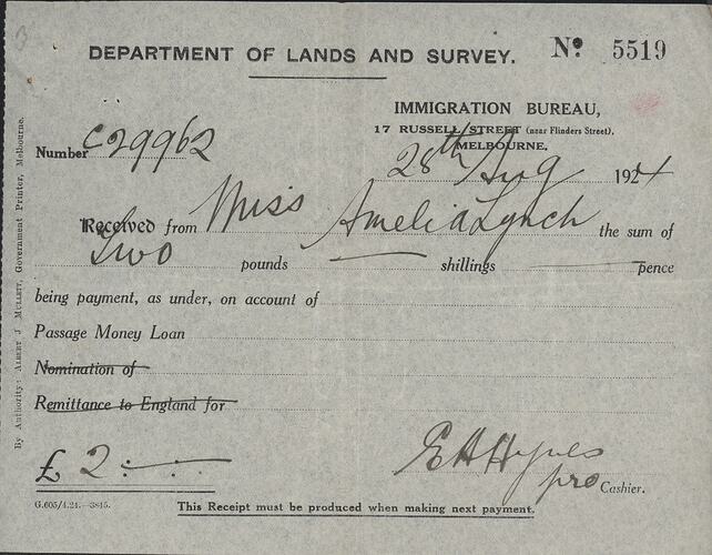 "DEPARTMENT OF LANDS AND SURVEY. No. 5519/ IMMIGRATION BUREAU,/ 17 RUSSELL STREET (Near Flinders Street),/MELBOURNE,/ Number C29962/ 28th Aug 1924/ RECIEVED from Amelia Lynch the sum of/ Two ponds - shillings - pence/ being payment, as under, on account of/ Passage Money Loan/"