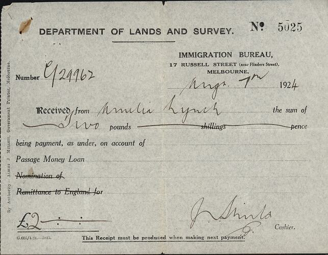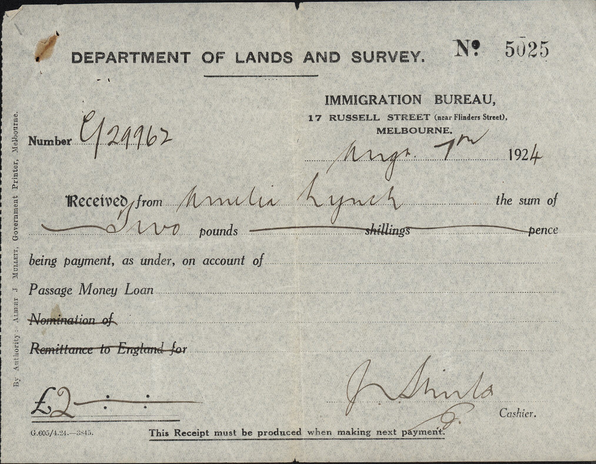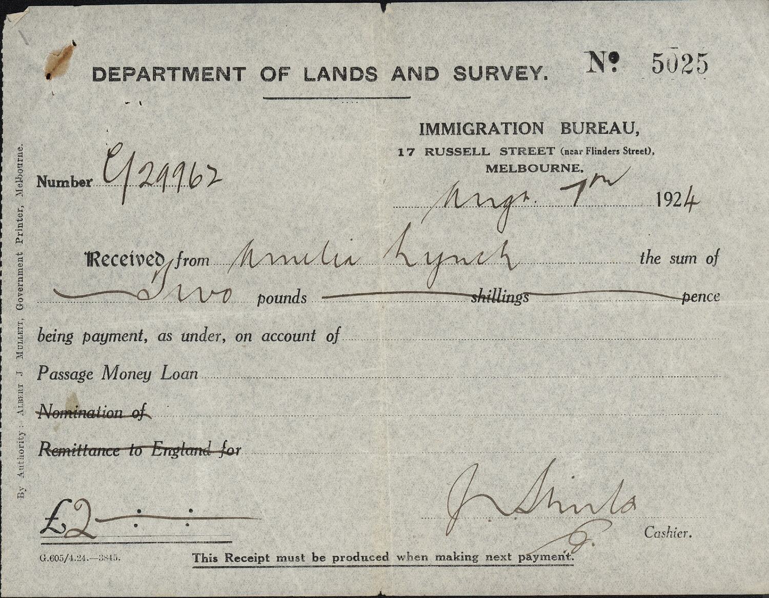 "DEPARTMENT OF LANDS AND SURVEY. No. 5025/ IMMIGRATION BUREAU,/ 17 RUSSELL STREET (Near Flinders Street),/MELBOURNE,/ Number G (?)29962/ Augt 7th 1924/ RECIEVED from Amelia Lynch the sum of/ Two pounds - shillings - pence/ being payment, as under, on account of/ Passage Money Loan/"