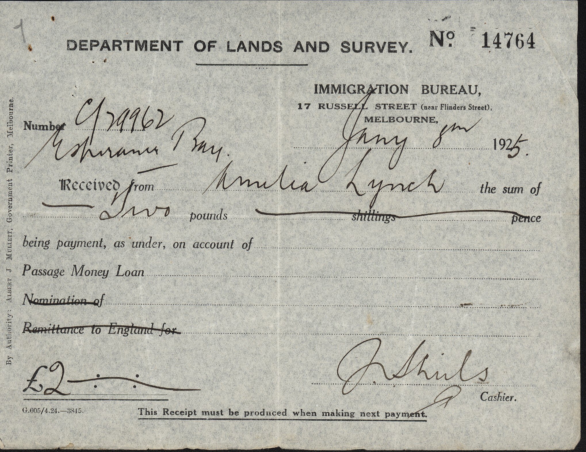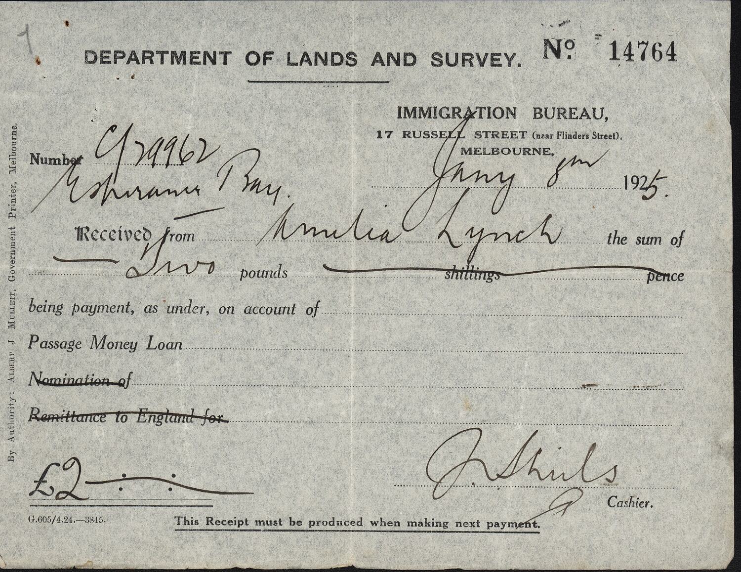 "DEPARTMENT OF LANDS AND SURVEY. No. 14764/ IMMIGRATION BUREAU,/ 17 RUSSELL STREET (Near Flinders Street),/MELBOURNE,/ Number G. 29962/ Esperance Bay Jany 8th 1925/ RECIEVED from Amelia Lynch the sum of/ Two ponds - shillings - pence/ being payment, as under, on account of/ Passage Money Loan"