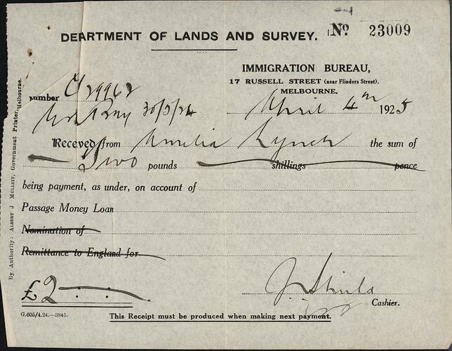"DEPARTMENT OF LANDS AND SURVEY. No. 23009/ IMMIGRATION BUREAU,/ 17 RUSSELL STREET (Near Flinders Street),/MELBOURNE,/ Number G29962/ Esp Bay. 30/5/24 April 4th 1925/ RECIEVED from Amelia Lynch the sum of/ Two pounds - shillings - pence/ being payment, as under, on account of/ Passage Money Loan/"