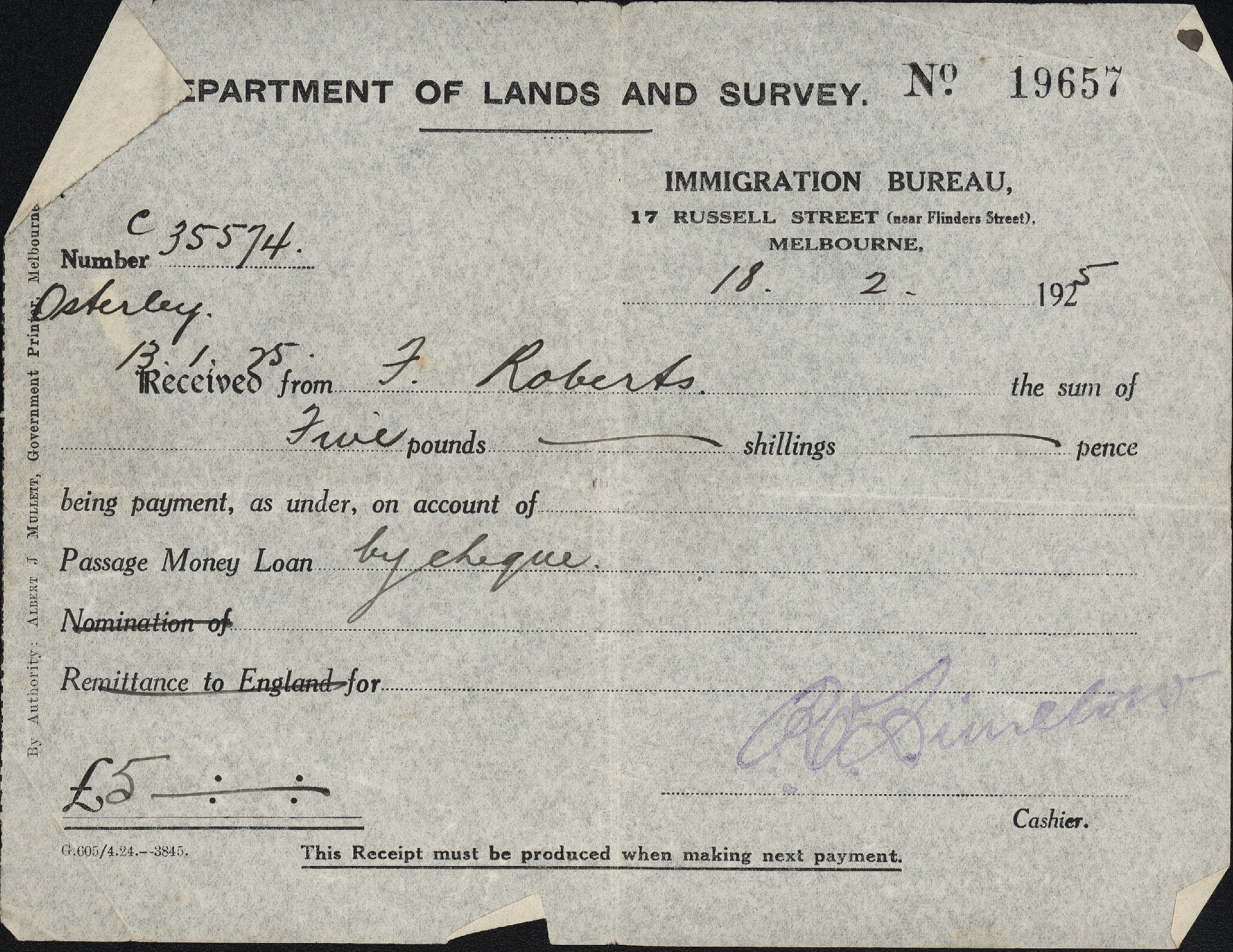 "DEPARTMENT OF LANDS AND SURVEY. No. 19657/ IMMIGRATION BUREAU,/ 17 RUSSELL STREET (Near Flinders Street),/MELBOURNE,/ Number C35574/ Osterley 18. 2. 1925/ 13.1.25/ RECIEVED from F. Roberts the sum of/ Five pounds - shillings - pence/ being payment, as under, on account of/ Passage Money Loan by cheque"