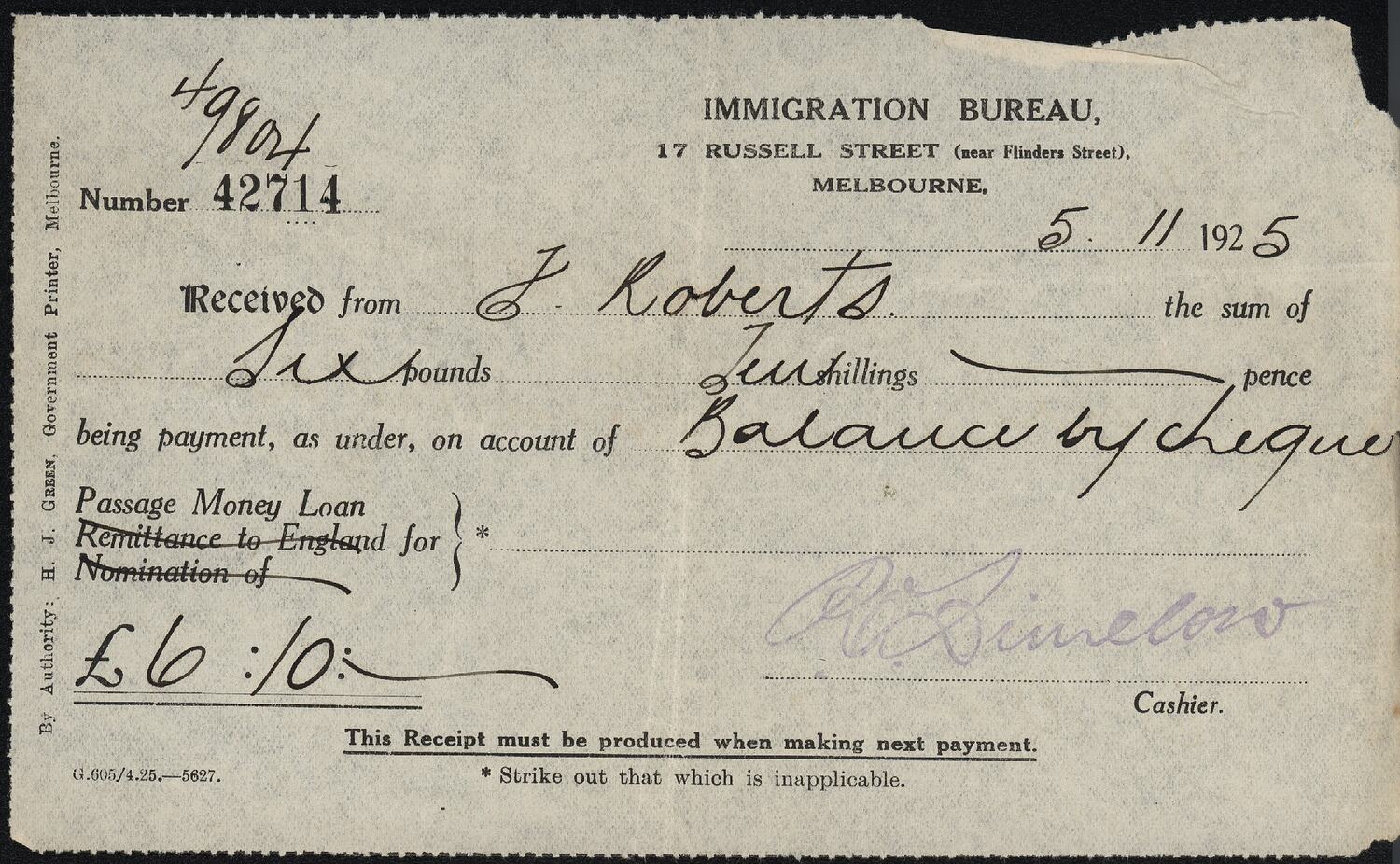 "49804 IMMIGRATION BUREAU,/ 17 RUSSELL STREET (Near Flinders Street),/MELBOURNE,/ Number 42714/ 5. 11 1925/ RECIEVED from F. Roberts the sum of/ Six pounds Ten shillings - pence/ being payment, as under, on account of Balance by cheque/ Passage Money Loan"