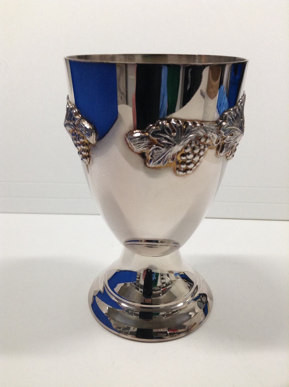 Goblet is copper based and silver plated, It is one of six within the collection which was made by Saracen Plate Co. This highly polished piece features a distinct grapevine motif and circular design. A saracen catalogue dated to 1960s features six of the goblets alongside a Cold Water Jug and Salver. The catalogue refers to the goblets featured on page 5 as reference no. R128. This historical record indicates that the goblets were inspired by the 'Old Sheffield Style'. These goblets are part of collection that details the work of George Kyriakides, and the successive silversmithing and jewellery businesses he was involved with.