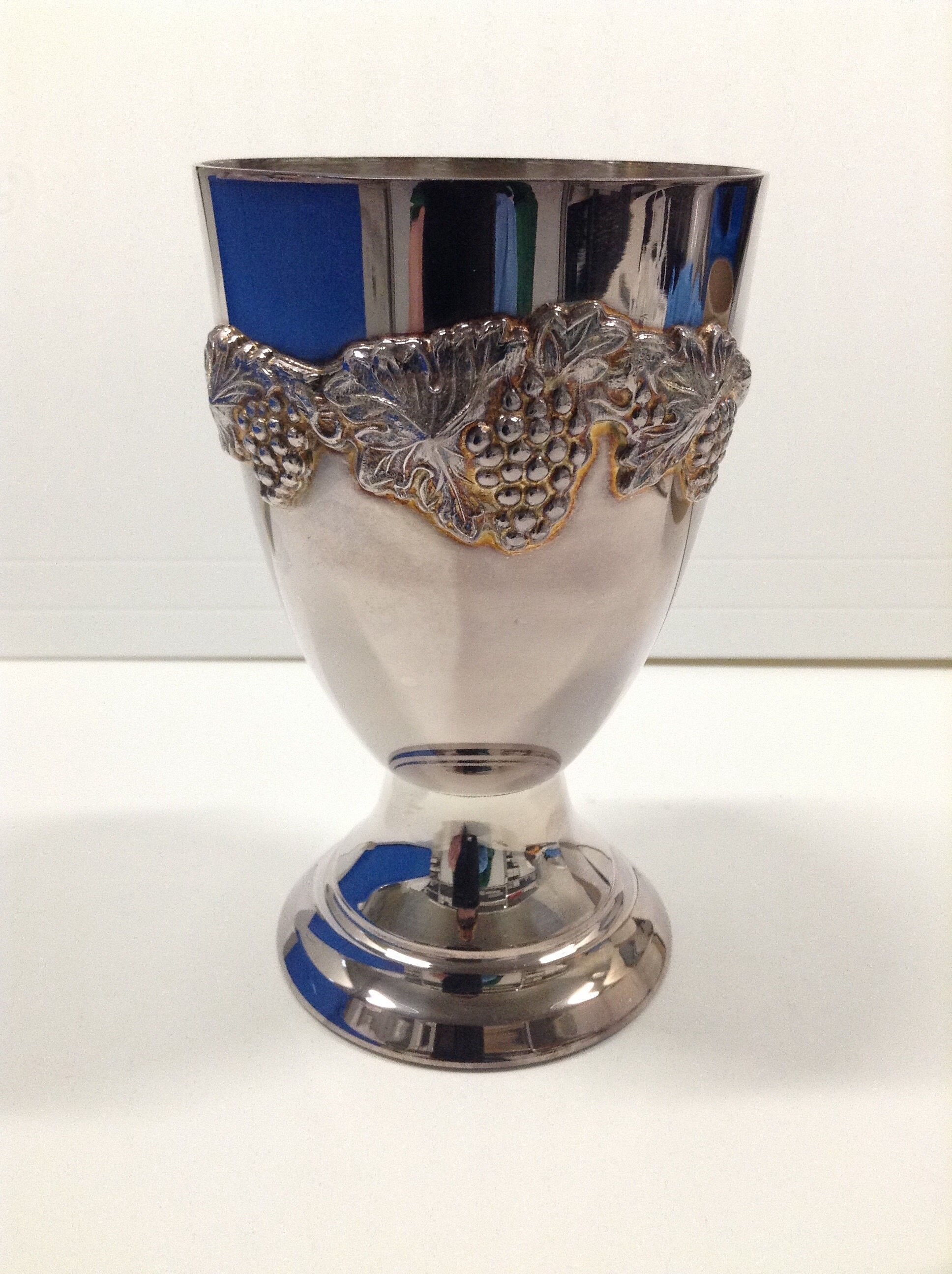 Silver goblet featuring grapevine design.