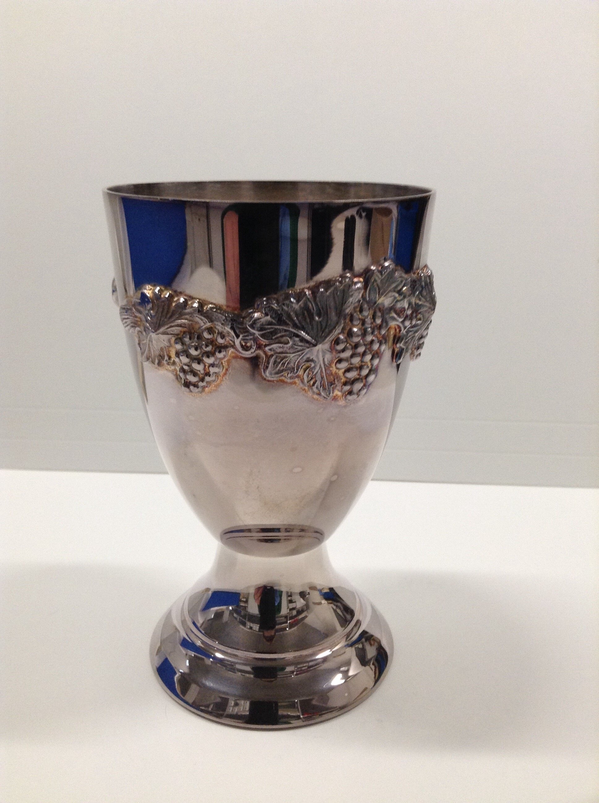 Silver goblet featuring grapevine design.