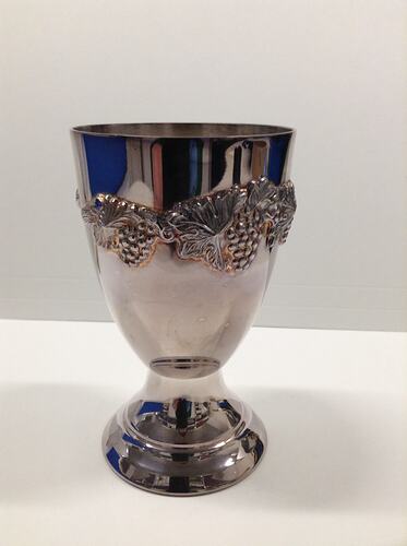 Goblet is copper based and silver plated, It is one of six within the collection which was made by Saracen Plate Co. This highly polished piece features a distinct grapevine motif and circular design. A saracen catalogue dated to 1960s features six of the goblets alongside a Cold Water Jug and Salver. The catalogue refers to the goblets featured on page 5 as reference no. R128. This historical record indicates that the goblets were inspired by the 'Old Sheffield Style'. These goblets are part of collection that details the work of George Kyriakides, and the successive silversmithing and jewellery businesses he was involved with.
