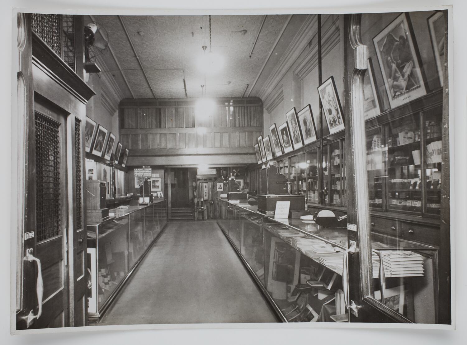 Shop interior showing display cabinets of cameras and photographic equipment. Timber panelled walls and timber staircase. Books in cabinet at right.