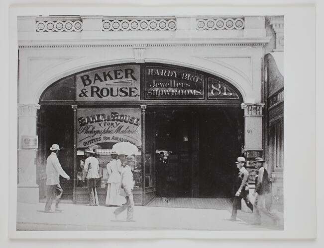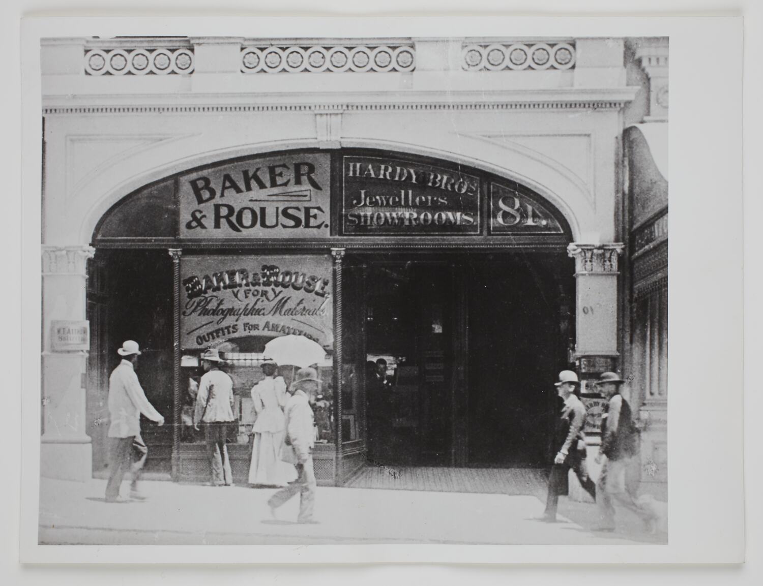 Shopfront under arches - Baker & Rouse sign on left and Hardy Brothers sign on right. Pedestrians on footpath, and woman with parasol looking in Baker & Rouse window.