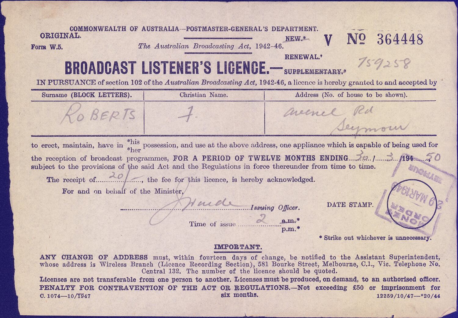 "COMMONWEALTH OF AUSTRALIA - POSTMASTER GENERAL'S DEPARTMENT / V NO. 364448 / Form W.5. The Australian Broadcasting Act, 1942-46 / BROADCAST LISTENER'S LICENCE- RENEWAL.* 759258 / IN PURSUANCE of section 102 of the Australian Broadcasting Act, 1942-46, a licence is hereby granted to and accepted by / Surname (BLOCK LETTERS) | Christian Name | Address (No. of house to be shown) / ROBERTS | F | Avenel Rd Seymour / to erect, maintain, have in *his/*her possession, and use, at the above address, one appliance which is capable of being used for / the reception of broadcast programmes, FOR A PERIOD OF TWELVE MONTHS ENDING 30/3/1950 / subject to the provisions of the said Act, and Regulations in force thereunder from time to time. / The receipt of 20/-, the fee for this licence, is hereby acknowledged, For and behalf of the Minister, / ..... Issuing Officer. DATE STAMP. / Time of issue 2 p.m. / IMPORTANT / ANY CHANGE OF ADDRESS must, within fourteen days of the change , be notified to the Assistant Superintendent, / whose address is Wireless Branch (Licence Recording Section), 581 Bourke Street, Melbourne, C.1, Vic, Telephone No. / Central 132. The number of the licence should be quoted. / Licences are not transferable from one person to another. Licences must be produced, on demand, to an authorised officer. / PENALTY FOR CONTRAVENTION OF THE ACT OR REGULATIONS.- Not exceeding £50 or imprisonment for / 6 months. / C. 1074---10/1947 12259/10/47-*20/44"