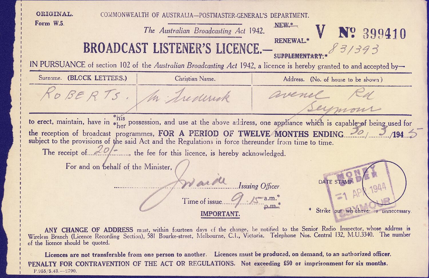 Radio licence belonging to Frederick and Amelia Roberts of Seymour valid for one year ending 30 March 1945. Frederick and Amelia came out separately to Australia from England between 1924-25 and married in 1926, later settling in Seymour, Victoria.