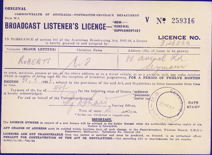 "ORIGINAL/ COMMONWEALTH OF AUSTRALIA - POSTMASTER GENERAL'S DEPARTMENT / Form W.5. / V NO. 259316 / The Australian Broadcasting Act, 1942 / BROADCAST LISTENER'S LICENCE.- RENEWAL.* 437543 / IN PURSUANCE of section 102 of the Australian Broadcasting Act, 1942-48, a licence / is hereby granted to and accepted by: / LICENCE No. 3/26560 / Surname (BLOCK LETTERS) | Christian Name | Address (No. of house to be shown) / ROBERTS | F | 86 Avenel Rd Seymour / to erect, maintain, possess or use, at the above address, or in a motor vehicle, or as a portable unit, one radio receiver / which is capable of being used for the reception of broadcast programmes, FOR A PERIOD OF TWELVE MONTHS / ENDING 30/3/1953, subject to the provisions of the said Act, and Regulations in force thereunder from time / to time. / Payment of the fee of 20/-, for the following class of licence / is hereby acknowledged, / For and behalf of the Postmaster-General, / ..... Issuing Officer. DATE STAMP. / Time of issue 2 p.m. / IMPORTANT / The LICENCE NUMBER in respect of a new licence will be advised to the holder thereof, when the notification regarding expiry of the / licence is forwarded. / ANY CHANGE OF ADDRESS must, within fourteen days of the change, be notified to the Superintendent, Wireless Branch P.M.G.'s Department, Melbourne. Telephone No. Central 132. / LICENCES ARE NOT TRANSFERABLE from one person to another and must be produced, on demand, to an authorised officer. / PENALTY FOR CONTRAVENTION OF THE ACT OR REGULATIONS.- Not exceeding £50 or imprisonment for six months. / 41600/11/50---*20/44"