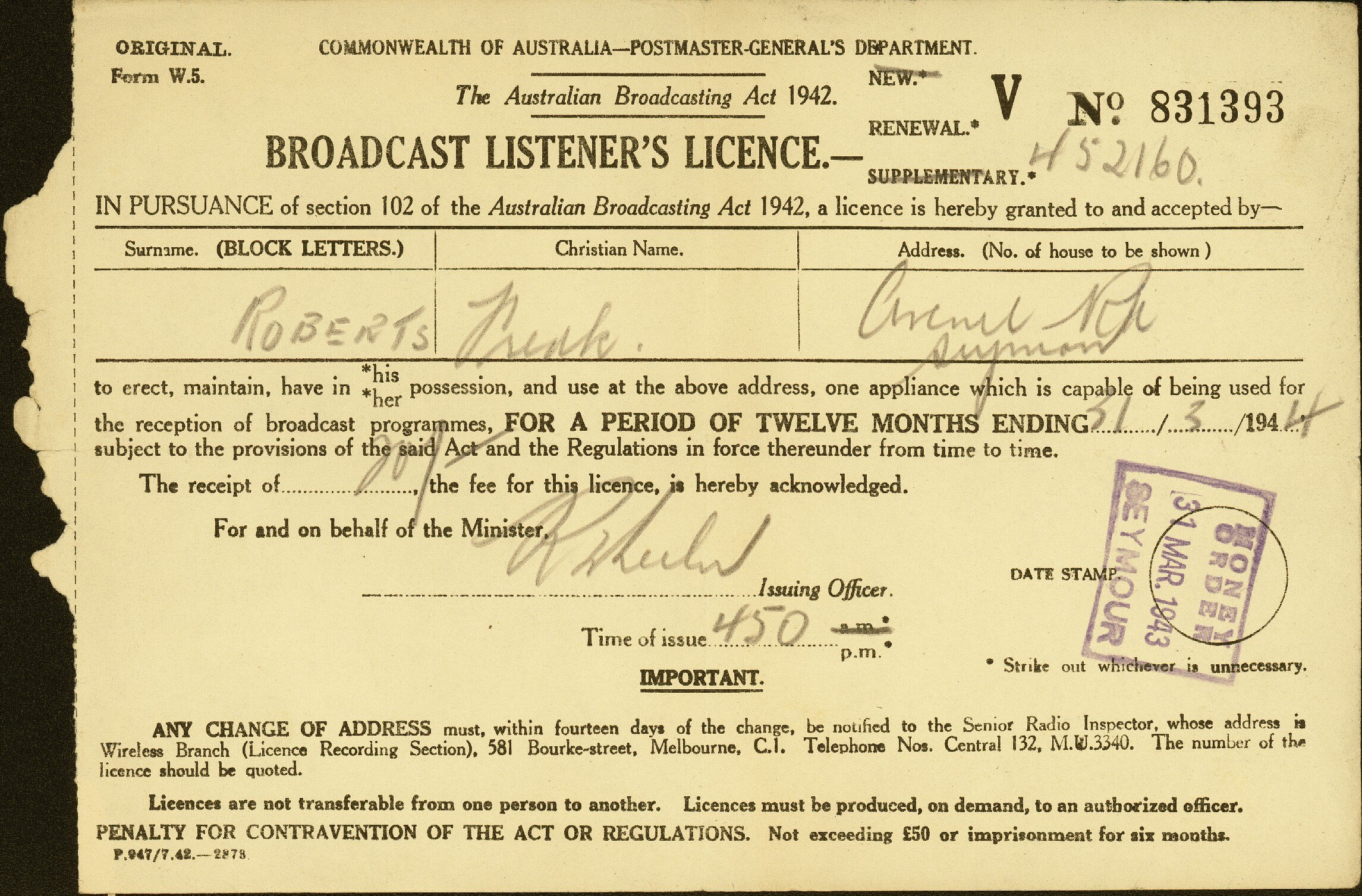 "ORIGINAL/ COMMONWEALTH OF AUSTRALIA - POSTMASTER GENERAL'S DEPARTMENT / Form W.5. / / The Australian Broadcasting Act, 1942 / V NO. 831393 / BROADCAST LISTENER'S LICENCE.- RENEWAL.* 452160 / IN PURSUANCE of section 102 of the Australian Broadcasting Act, 1942, a licence is hereby granted to and accepted by- / Surname (BLOCK LETTERS) | Christian Name | Address (No. of house to be shown) / ROBERTS | Fredk | Avenel Rd / Seymour / to erect, maintain, have in *his/*her possession, and use, at the above address, one appliance which is capable of being used for / the reception of broadcast programmes FOR A PERIOD OF TWELVE MONTHS ENDING 31/3/1944, / subject to the provisions of the said Act, and Regulations in force thereunder from time / to time. / The receipt of 20/-, the fee for this licence, is hereby acknowledged, / For and behalf of the Minister, / ..... Issuing Officer. DATE STAMP. / Time of issue 4.50 p.m. / IMPORTANT / ANY CHANGE OF ADDRESS must, within fourteen days of the change , be notified to the Senior Radio Inspector, whose address is / Wireless Branch (Licence Recording Section), 581 Bourke-street, Melbourne, C.1. Telephone Nos. Central 132, M.U.3340. The number of the / licence should be quoted / Licences are not transferable from one person to another. Licences must be produced, on demand, to an authorised officer. / PENALTY FOR CONTRAVENTION OF THE ACT OR REGULATIONS.- Not exceeding £50 or imprisonment for six months. / P.947/7.42--2878."