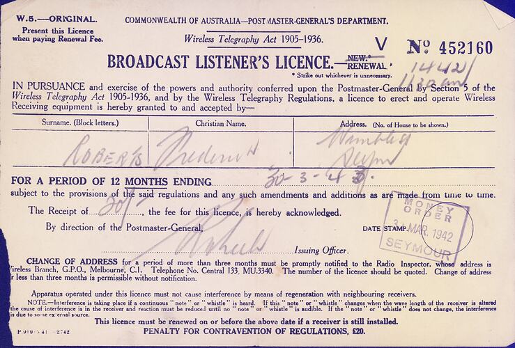"W.5. ORIGINAL. COMMONWEALTH OF AUSTRALIA - POSTMASTER GENERAL'S DEPARTMENT. / Present this Licence when paying Renewal Fee / Wireless Telegraphy Act 1905-1936 / V No. 452160 / BROADCAST LISTENER'S LICENCE.- RENEWAL.* 1442 / IN PURSUANCE and exercise of the powers and authority conferred upon the Postmaster-General by Section 5 of the / Wireless Telegraphy Act 1905-1936, and by the Wireless Telegraphy Regulations, a licence to erect and operate a Wireless Receiving equipment is hereby granted to and accepted by- / Surname (Block Letters) | Christian Name | Address (No. of house to be shown) / ROBERTS | Frederick | ? / Seymour / FOR A PERIOD OF TWELVE MONTHS ENDING 30-3-43 / subject to the provisions of the said regulations and any such amendments as are made from time to time. / The receipt of 20/-, the fee for this licence, is hereby acknowledged, / By direction of the Postmaster-General, DATE STAMP/ ..... Issuing Officer. / CHANGE OF ADDRESS for period of more than three months must be promptly notified to the Radio Inspector, whose address is/ Wireless Branch. G.P.O., Melbourne, C.1. Telephone No. Central 132, MU.3340. The number of the licence should be quoted. Change of address for less than three months is permissible without notification. / Apparatus under this licence must not cause interference by means of regeneration with neighbouring receivers. / NOTE.- Interference is taking place if a continuous "note" or "whistle" is heard. If this "note or "whistle changes when the wave length of the receiver is altered the cause of interference is in the receiver and reaction must be reduced until no "note" or "whistle" is audible. If the "note" or "whistle" does not change, the interference is due to some external source. / This licence must be renewed on or before the above date if a receiver is still installed. / PENALTY FOR CONTRAVENTION OF REGULATIONS, £20."