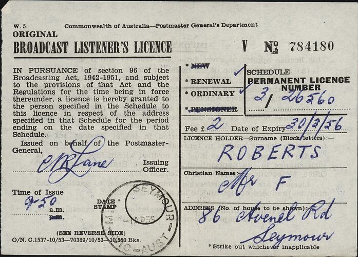 "W.5. ORIGINAL. Commonwealth of Australia--Postmaster General's Department / BROADCAST LISTENER'S LICENCE V No. 784180 / IN PURSUANCE of section 96 of the / Broadcasting Act, 1942-1951, and subject / to the provisions of that Act and the / Regulations for the time being in force / thereunder, a licence is hereby granted to the person specified in the Schedule to / this licence in respect of the address / specified in that Schedule for the period / ending on the date specified in that / Schedule. / Issued on behalf of the Postmaster- / General, / ...... Issuing Officer./ Time of issue DATE STAMP / 9.50 a.m. / (SEE REVERSE SIDE) / O/N. C.1537-10/53--70389/10/53---10,550 Bks. / SCHEDULE / *RENEWAL PERMANENT LICENCE / NUMBER / 3/26560/ Fee £2 Date of Expiry 30 /3/56 / LICENCE HOLDER - Surname (Block Letters) :- / ROBERTS / Christian Names:- Mr F / ADDRESS (No. of house to be shown) :- / 86 Avenel Rd / Seymour"