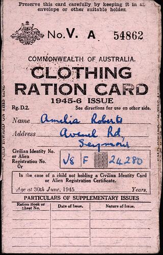 (Front) "Preserve this card carefully by keeping it in an envelope or other suitable holder. / No. V. A 54862 / COMMONWEALTH OF AUSTRALIA. / CLOTHING / RATION CARD / 1945-6 ISSUE / Rg. D.2. See directions for use on other side. / Name Amelia Roberts / Address Avenel Rd., / Seymour / Civilian Identity No. / or Alien / Registration No. V8 F 24280 / PARTICULARS OF SUPPLEMENTARY ISSUES/ Ration Book or Sheet No. / Date of Issue / Nature of Issue" (Reverse) "COMMONWEALTH OF AUSTRALIA / CLOTHING RATION CARD / DIRECTIONS FOR USE / 1. As soon as you receive this Clothing Ration Card, sign / your usual signature and insert the date of receipt in the space / provided below. This may assist in identification if the / Clothing Card is lost. / 2. When obtaining coupon goods you must hand your Clothing / Ration Card to the shopkeeper, who will cut out the / appropriate number of coupons in your presence. Loose / coupons must not be tendered or accepted except as provided / in paragraph 3. / 3. When ordering goods by post do not send your Clothing / Card. Cut off the required number of coupons, sign your name / and quote the Card No. on the back, and send the coupons with your order. / 4. The pages of Y and Z coupons must not be detached from / the middle section of the card bearing particulars of name, &c. / Coupons from these pages so detached cannot be accepted by traders. / 5. Keep this card carefully. It will be difficult to replace / it. If the card is lost or destroyed, report the matter at once / to the Deputy Director of Rationing for the State. / 6. It is an offence to deface or alter any part of this card or / remove any coupon except in accordance with Orders or directions of the Commission. / 7. If you join the Services this card and your Food Ration / Book must be surrendered at the time of enrolment. / 8. If you leave Australia (or Australian Territory) this Card / and your Food Ration Book must be surrendered to the Customs Boarding Officer. / 9. Any person having possession of the Clothing Ration Card / or Food Ration Book of any deceased person must surrender it / to the Registrar either personally or through agency of the / person registering the death. / 10. All inquiries and comments regarding rationing should be / addressed to--- / THE DEPUTY DIRECTOR OF RATIONING, / CAVENDISH HOUSE/ 159 FLINDERS LANE, MELBOURNE./ Signature of Holder ...../"