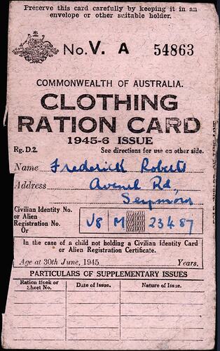 (Front) "Preserve this card carefully by keeping it in an envelope or other suitable holder. / No. V. A 54863 / COMMONWEALTH OF AUSTRALIA. / CLOTHING / RATION CARD / 1945-6 ISSUE / Rg. D.2. See directions for use on other side. / Name Frederick Roberts / Address Avenel Rd., / Seymour / Civilian Identity No. / or Alien / Registration No. V8 F 23487 / PARTICULARS OF SUPPLEMENTARY ISSUES/ Ration Book or Sheet No. / Date of Issue / Nature of Issue" (Reverse) "COMMONWEALTH OF AUSTRALIA / CLOTHING RATION CARD / DIRECTIONS FOR USE / 1. As soon as you receive this Clothing Ration Card, sign / your usual signature and insert the date of receipt in the space / provided below. This may assist in identification if the / Clothing Card is lost. / 2. When obtaining coupon goods you must hand your Clothing / Ration Card to the shopkeeper, who will cut out the / appropriate number of coupons in your presence. Loose / coupons must not be tendered or accepted except as provided / in paragraph 3. / 3. When ordering goods by post do not send your Clothing / Card. Cut off the required number of coupons, sign your name / and quote the Card No. on the back, and send the coupons with your order. / 4. The pages of Y and Z coupons must not be detached from / the middle section of the card bearing particulars of name, &c. / Coupons from these pages so detached cannot be accepted by traders. / 5. Keep this card carefully. It will be difficult to replace / it. If the card is lost or destroyed, report the matter at once / to the Deputy Director of Rationing for the State. / 6. It is an offence to deface or alter any part of this card or / remove any coupon except in accordance with Orders or directions of the Commission. / 7. If you join the Services this card and your Food Ration / Book must be surrendered at the time of enrolment. / 8. If you leave Australia (or Australian Territory) this Card / and your Food Ration Book must be surrendered to the Customs Boarding Officer. / 9. Any person having possession of the Clothing Ration Card / or Food Ration Book of any deceased person must surrender it / to the Registrar either personally or through agency of the / person registering the death. / 10. All inquiries and comments regarding rationing should be / addressed to--- / THE DEPUTY DIRECTOR OF RATIONING, / CAVENDISH HOUSE/ 159 FLINDERS LANE, MELBOURNE./ Signature of Holder ...../"