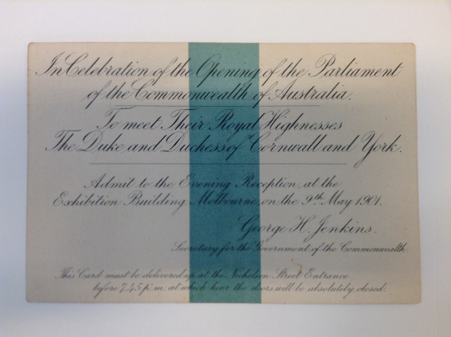 Printed on card:'In Celebration of the Opening of the Parliament/ of the Commonwealth of Australia / To meet Their Royal Highness / the Duke and Duchess of Cornwall and York / Admit to the Evening Reception at the / Exhibition Building Melbourne on the 9th of May 1901 / George H. Jenkins / Secretary for the Government of the Commonwealth / This Card must be delivered up at the Nicholson Street Entrance / before 7:45pm at which hour the doors will be absolutely closed.
