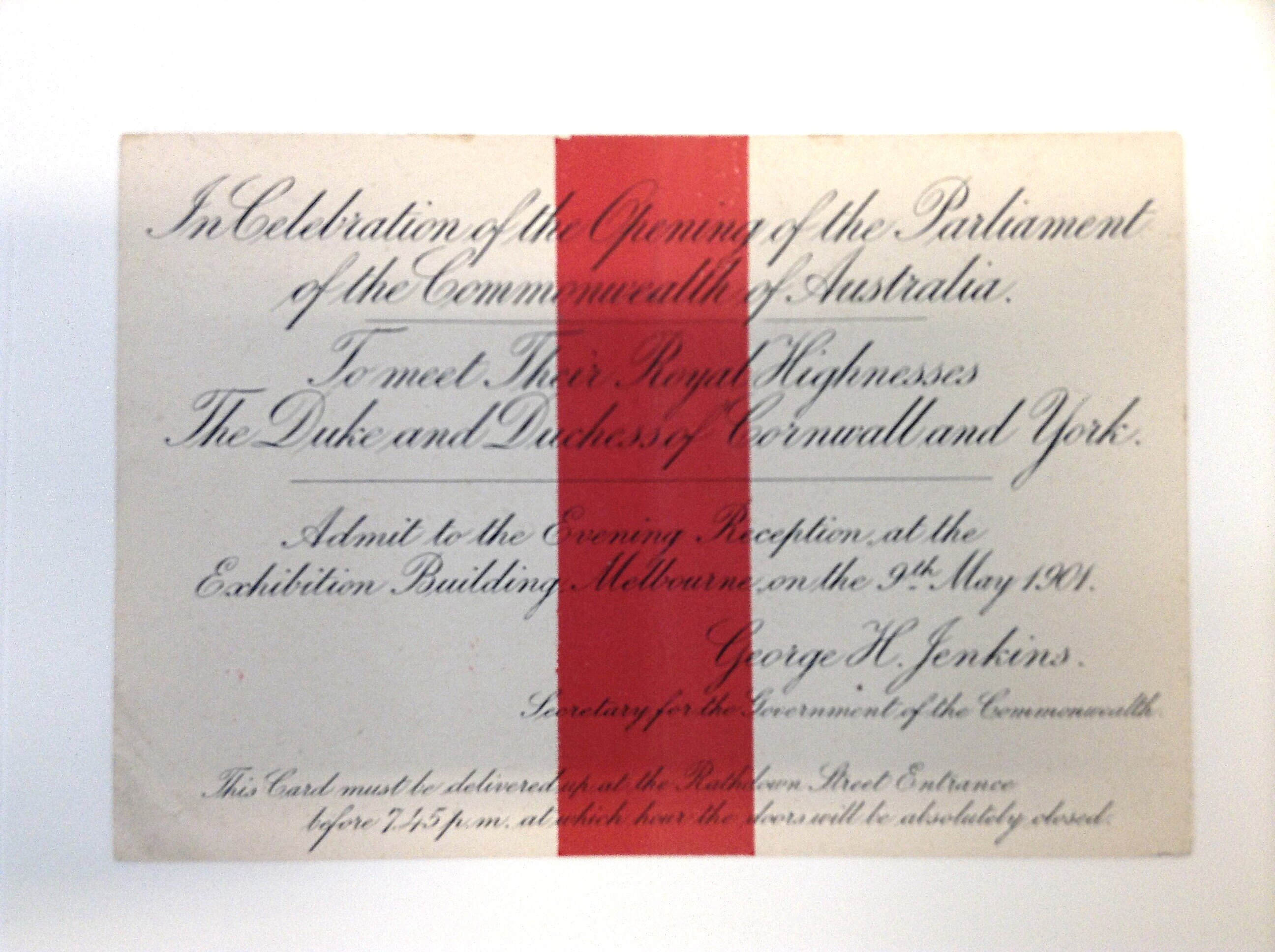 Printed on card:'In Celebration of the Opening of the Parliament/ of the Commonwealth of Australia / To meet Their Royal Highness / the Duke and Duchess of Cornwall and York / Admit to the Evening Reception at the / Exhibition Building Melbourne on the 9th of May 1901 / George H. Jenkins / Secretary for the Government of the Commonwealth / This Card must be delivered up at the Rathdown Street Entrance / before 7:45pm at which hour the doors will be absolutely closed.
