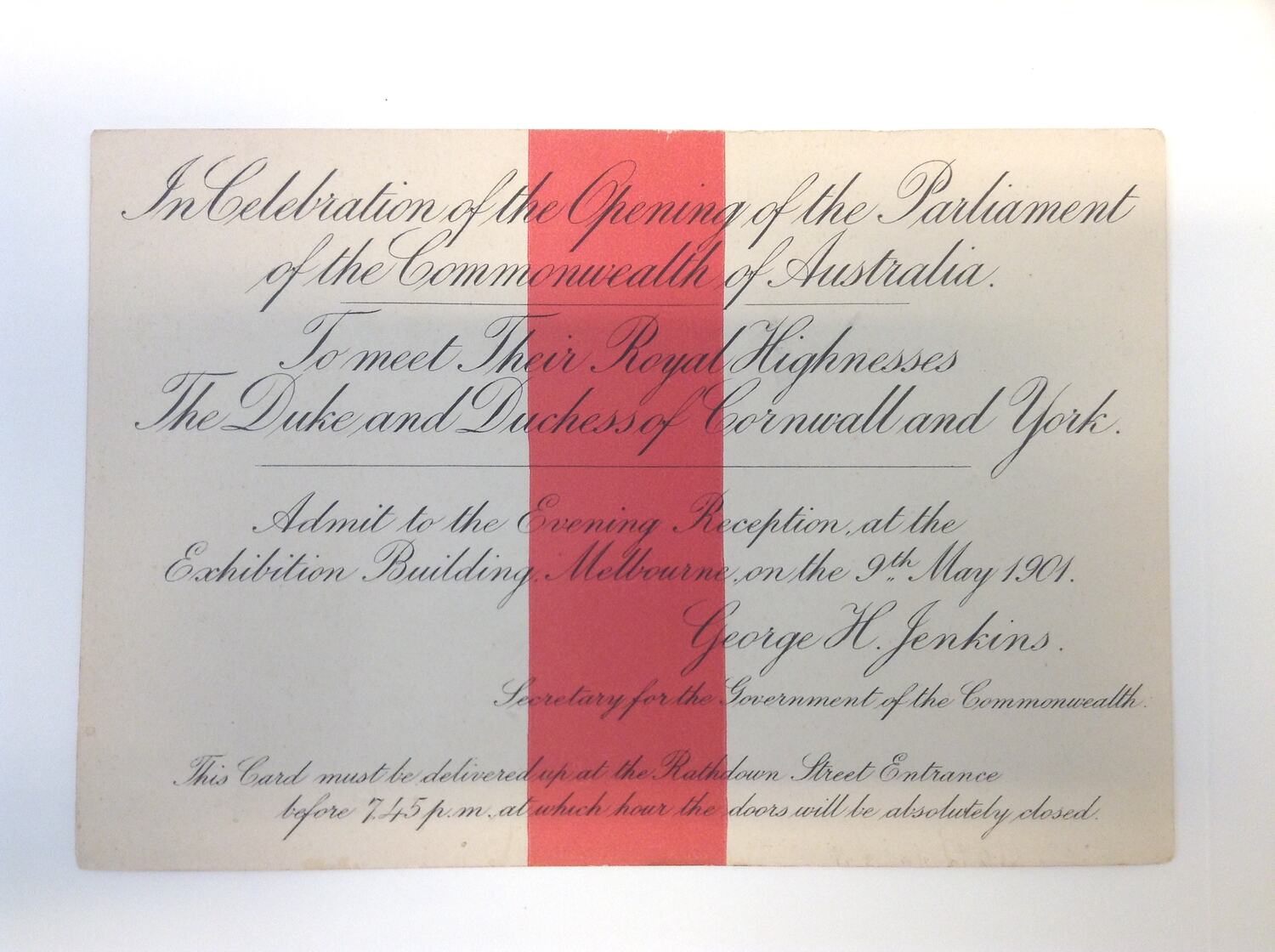 Printed on card:'In Celebration of the Opening of the Parliament/ of the Commonwealth of Australia / To meet Their Royal Highness / the Duke and Duchess of Cornwall and York / Admit to the Evening Reception at the / Exhibition Building Melbourne on the 9th of May 1901 / George H. Jenkins / Secretary for the Government of the Commonwealth / This Card must be delivered up at the Rathdown Street Entrance / before 7:45pm at which hour the doors will be absolutely closed.