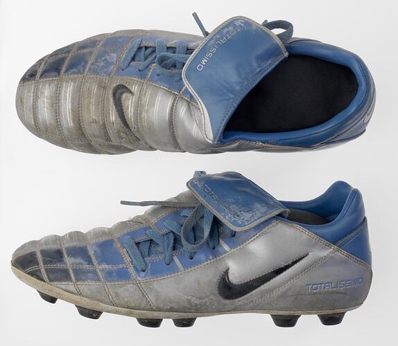First pair of football boots worn by Lin Jong when he played for his first football team the Glen Waverley Rovers in 2008. The boots are a size 12 and Lin was 15 years old. Lin was born in Melbourne in 1993, his parents migrants from East Timor and Taiwan. He commenced playing football at the age of 15 for suburban clubs and was drafted by the Western Bulldogs Football Club in 2012, debuting that same year. He is the first Australian Football League player of East Timorese and Taiwanese descent. Injury prevented him from playing in the 2016 Western Bulldogs premiership team but he was best on ground in the Victorian Football League Grand Final won by the Western Bulldogs.