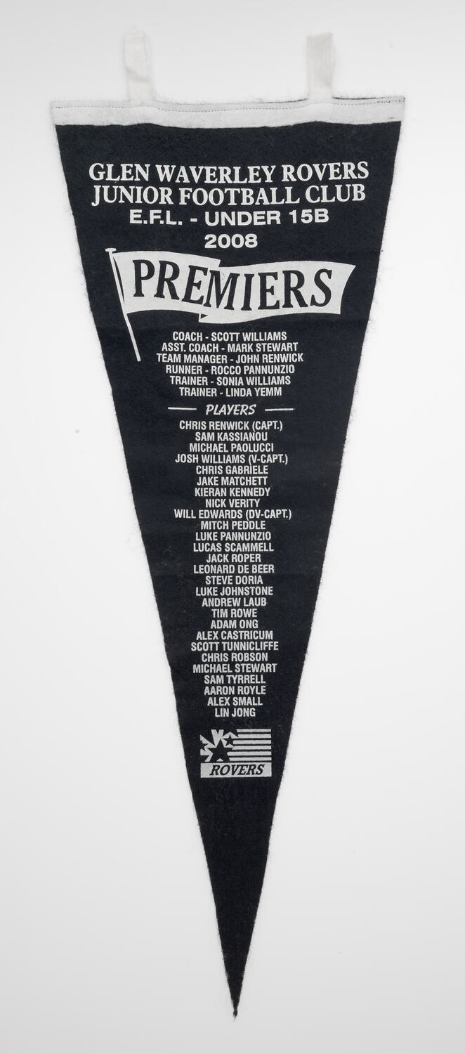 Pennant won by Lin Jong while playing for the Glen Waverley Rovers Football Club premiership team in 2008. This was his first year playing football. Lin was born in Melbourne in 1993, his parents migrants from East Timor and Taiwan. He commenced playing football at the age of 15 for suburban clubs and was drafted by the Western Bulldogs Football Club in 2012, debuting that same year. He is the first Australian Football League player of East Timorese and Taiwanese descent. Injury prevented him from playing in the 2016 Western Bulldogs premiership team but he was best on ground in the Victorian Football League Grand Final won by the Western Bulldogs.