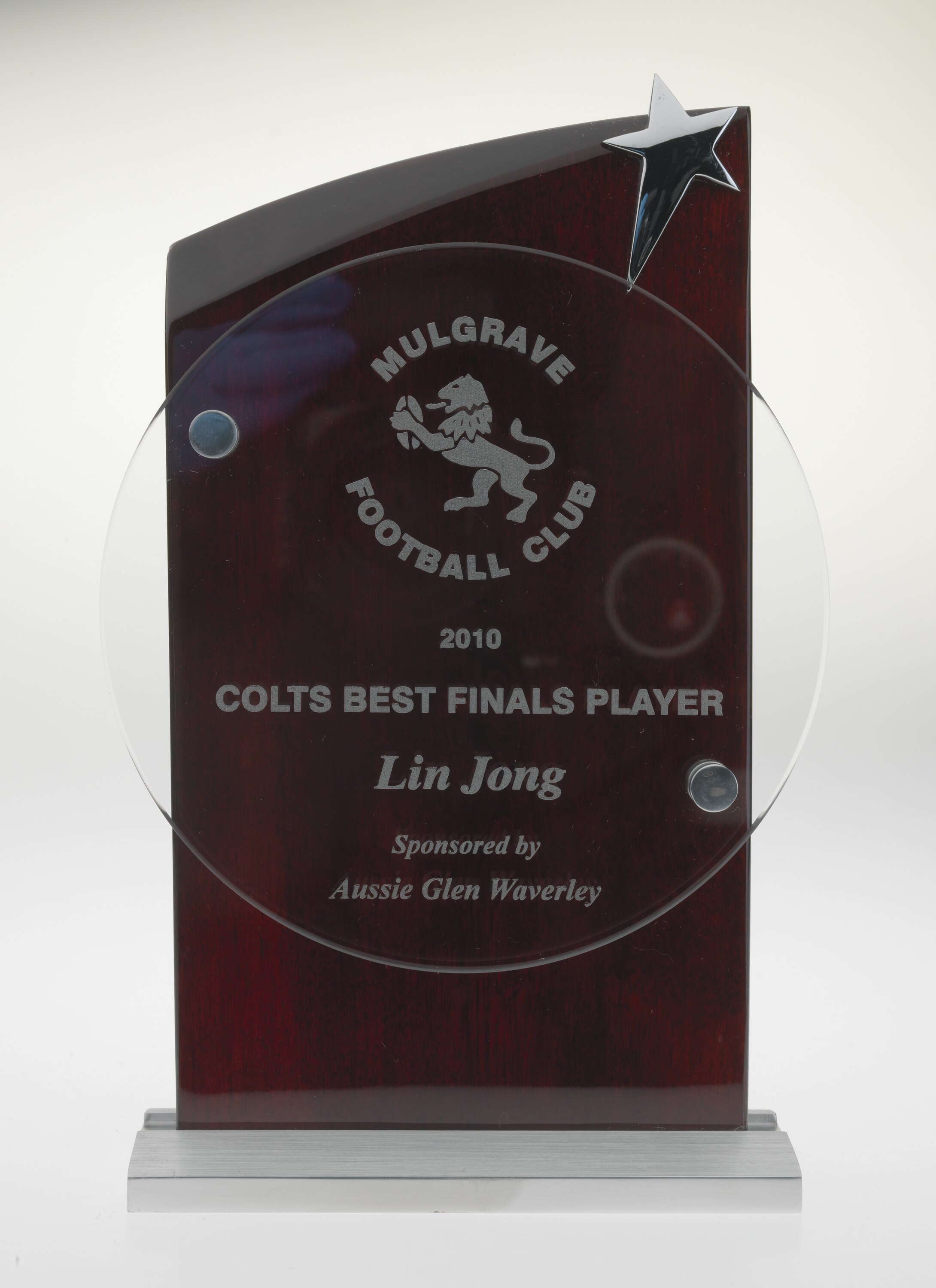 Trophy won by Lin Jong for best player during a premiership match for the Mulgrave Colts Football Club in 2010. Lin was born in Melbourne in 1993, his parents migrants from East Timor and Taiwan. He commenced playing football at the age of 15 for suburban clubs and was drafted by the Western Bulldogs Football Club in 2012, debuting that same year. He is the first Australian Football League player of East Timorese and Taiwanese descent. Injury prevented him from playing in the 2016 Western Bulldogs premiership team but he was best on ground in the Victorian Football League Grand Final won by the Western Bulldogs.