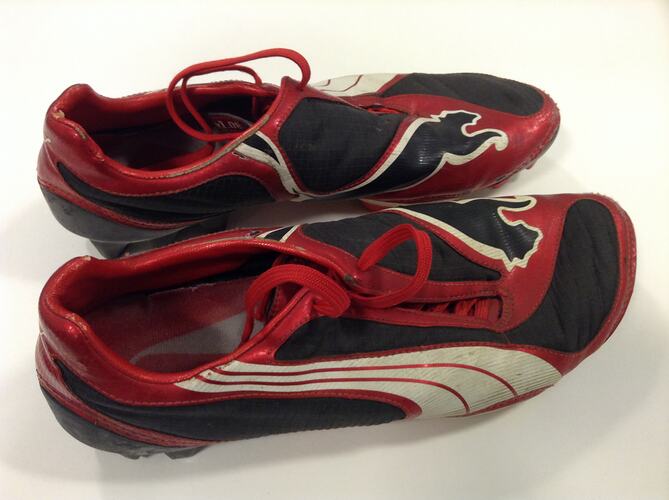Pair of football boots worn by Jason Johannisen while playing for the Willetton Junior Football Club in Perth between 2001 and 2009. Jason was born in Johannesburg in South Africa in 1992, and he migrated to Perth in Western Australia with his family in 2000. His mother Sonya was born in Zambia and his father Eldrid in Durban, South Africa. He commenced playing football at the age of 15 for suburban clubs and was drafted by the Western Bulldogs Football Club in 2012, debuting that same year. He is the first Australian Football League player of South African descent.