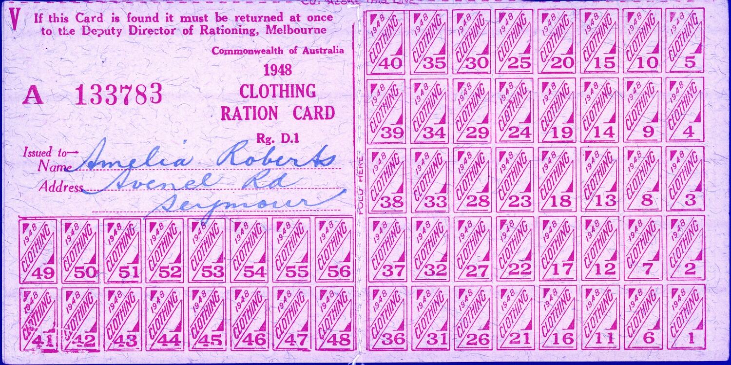 "If this card is found it must be returned at once to the Deputy Director of Rationing, Melbourne. / Commonwealth of Australia / A 133783 / 1948 / CLOTHING / RATION CARD / Rg. D.1 / Issued to / Name Amelia Roberts / Address Avenel Rd/ Seymour/ "If this card is found it must be returned at once to the Deputy Director of Rationing, Melbourne. / Commonwealth of Australia / A 133783 / 1948 / CLOTHING / RATION CARD / Rg. D.1 / Issued to / Name Frederick Roberts / Address Avenel Rd/ Seymour"