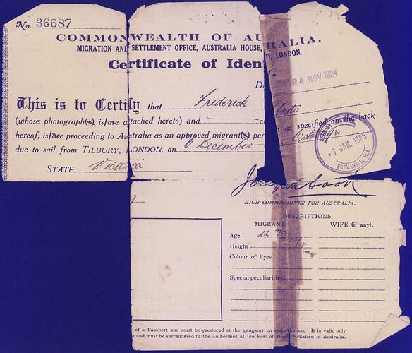 "No. 36687 / COMMONWEALTH OF AUSTRALIA. / MIGRATION AND SETTLEMENT OFFICE, AUSTRALIA HOUSE, STRAND, LONDON. / Certificate of Identity. / Date 24 NOV 1924 / This is to Certify that Frederick Roberts / (whose photograph is attached hereto) and - children specified on the back / hereof, is proceeding to Australia as an approved migrant per the Osterley / due to sail from TILBURY, LONDON, on 6 December, 1924 / STATE Victoria / HIGH COMMISSIONER FOR AUSTRALIA. / DESCRIPTIONS. / MIGRANT WIFE (if any) / Age 22 4/12 / Height 5 '7 3/4 / Colour of Eyes / Special peculiarities " Stamped: "SEEN BY CUSTOMS / 4 / 7 JAN 1925 / FREMANTLE W.A."