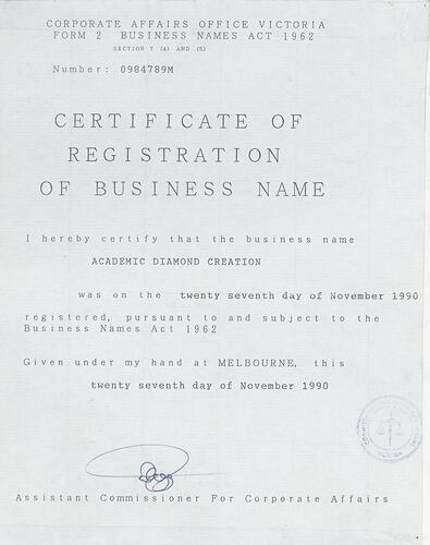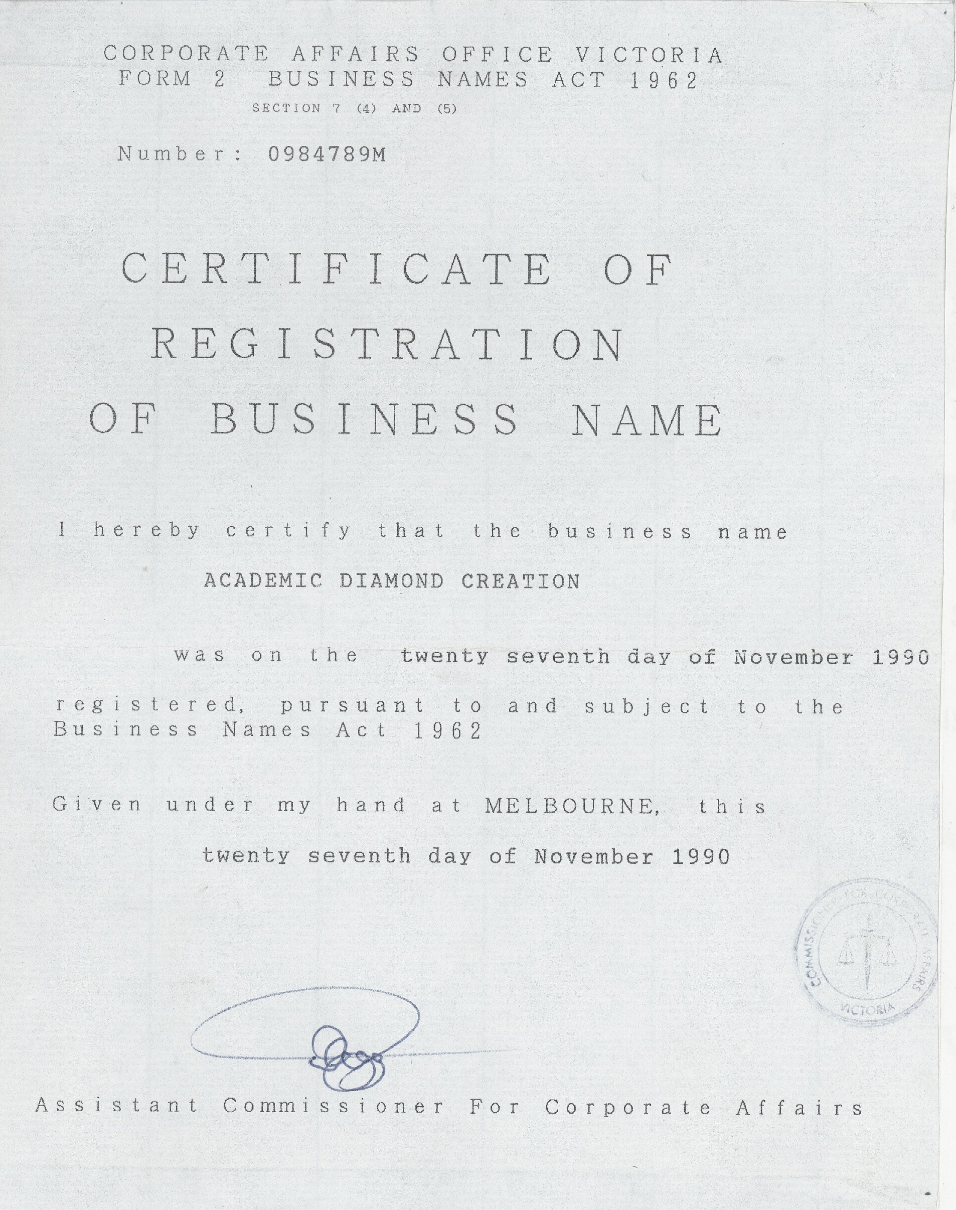 "CORPORATE AFFAIRS OFFICE VICTORIA/ FORM 2 BUSINESS NAMES ACT 1962/ SECTION 7 (4) AND (5)/ NUMBER 0984789M/ CERTIFICATE OF/ REGISTRATION / OF BUSINESS NAME/ I hereby certify that the business name/ ACADEMIC DIAMOND CREATION/ was on the twenty seventh day of November 1990/ registered, pursuant to and subject to the/ Business Names Act 1962/ Given under my hand at MELBOURNE, this/ twenty seventh day of November 1990/ SIGNATURE/ Assistant Commissioner For Corporate Affairs"
