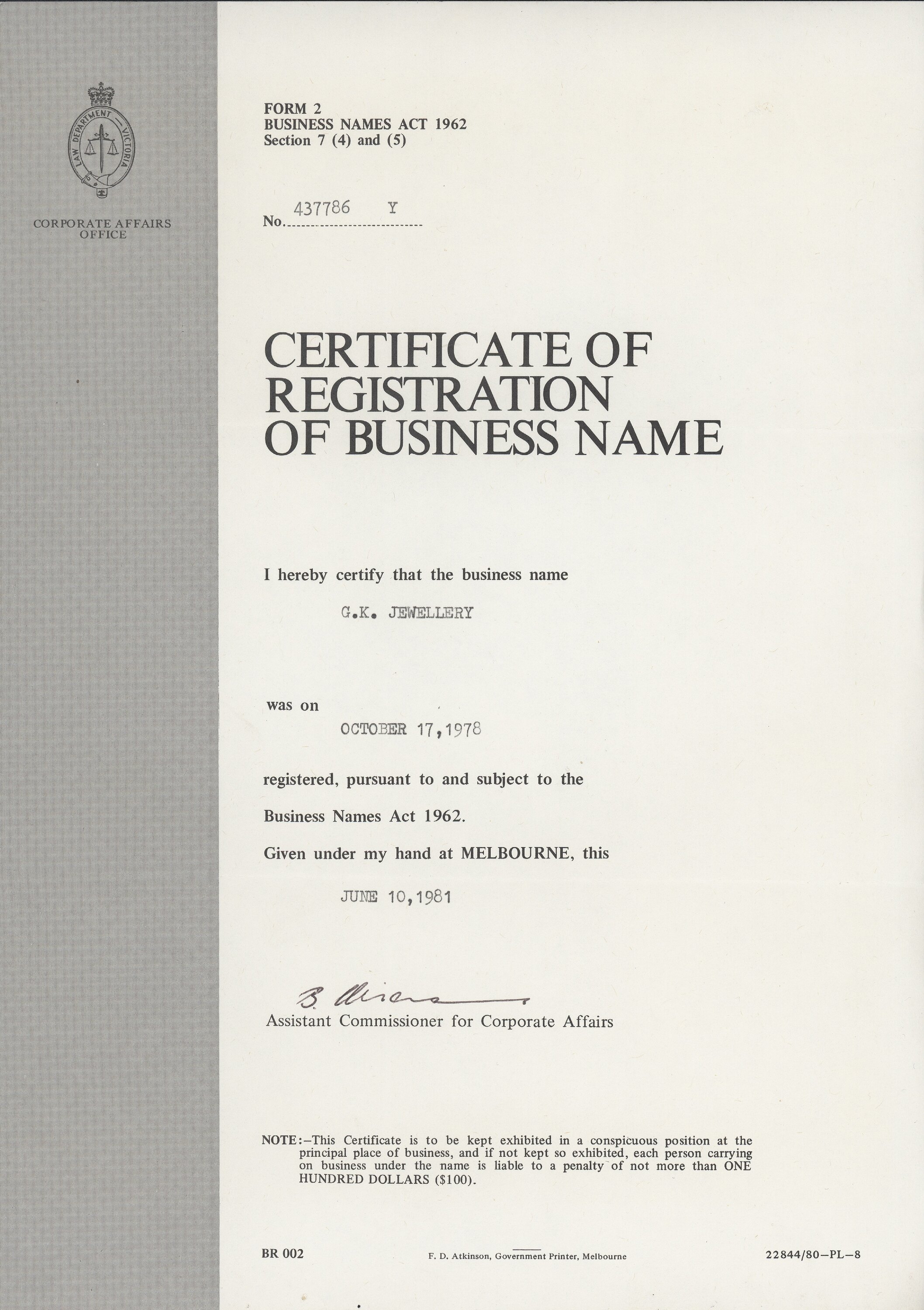 "CORPORATE AFFAIRS OFFICE/ FORM 2 /BUSINESS NAMES ACT 1962/ SECTION 7 (4) AND (5)/ No. 437786/ CERTIFICATE OF/ REGISTRATION/ OF BUSINESS NAME/ I hereby certify that the business name/ G. K. JEWELLERY/ was on OCTOBER 17, 1978/ registered, pursuant to and subject to the/ Business Names Act 1962. / Given under my hand at MELBOURNE, this/ JUNE 10, 1981/ SIGNATURE/ Assistant Commissioner for Corporate Affairs/ NOTE:- This certificate is to be kept exhibited in a conspicuous position at the/ principal place of business, and if not kept so exhibited, each person carrying/ on business under the name is liable to a penalty of not more than ONE/ HUNDRED DOLLARS ($100)"