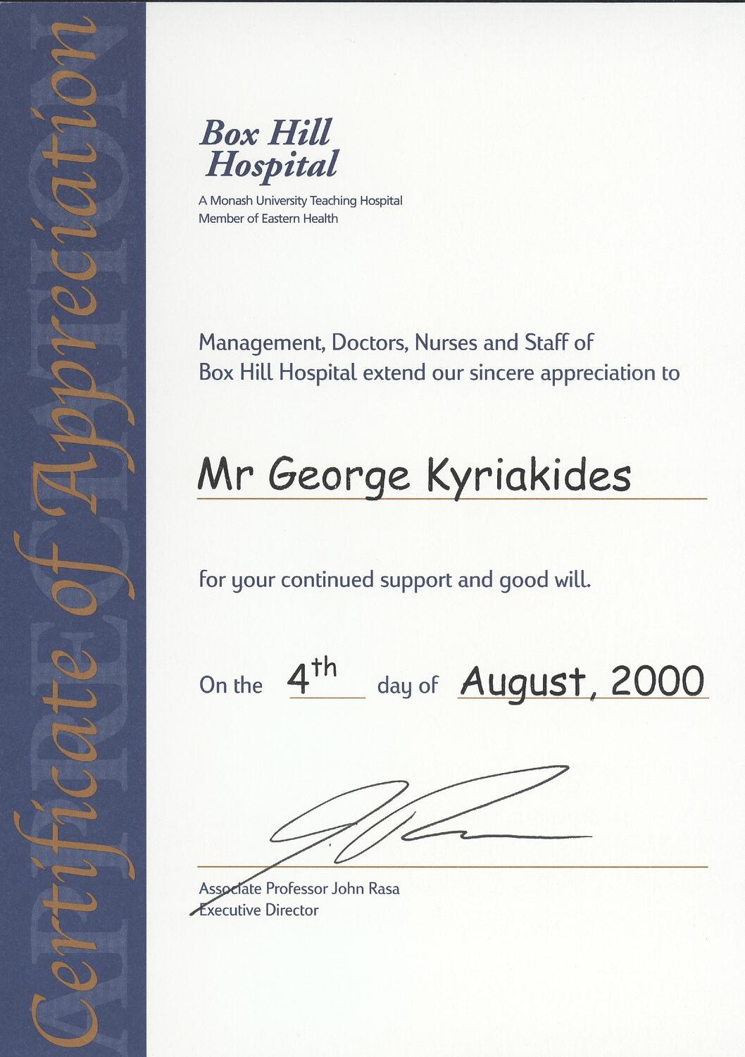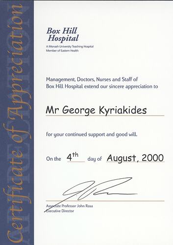 'Certificate of Appreciation\Box Hill Hospital\A Monash University Teaching Hospital\Member of Eastern Health\Management, Doctors, Nurses and Staff of\ Box Hill Hospital extend our sincere appreciation to\ Mr George Kyriakides\for your continued support and good will.\ On the 4th day of August, 2000\(signed)\Associate Professor John Rasa\Executive Director'