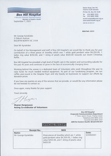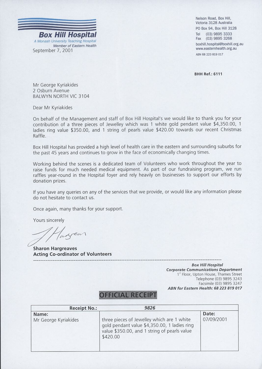 'Mr George Kyriakides\ 2 Osburn Avenue\Balwyn North 3104\ Dear Mr Kyriakides\On behalf of Management and staff of Box Hill Hospital's we would like to thank you for your\contribution of a three pieces of Jewellery which was 1 white gold pendant value $4,350,1\ladies ring value $350.00, and 1 string of peals value $420.00 towards our recent Christmas Raffle.\ Box Hill Hospital has provided a high level of health care in the eastern and surrounding suburbs for\ the past 45 years and continues to grow in the face of economically changing times.\ Working behind the scenes is a dedicated team of Volunteers who work throughout the year to\raise funds for much needed medical equipment. As part of our fundraising program, we run raffles year-round in the Hospital foyer and rely heavily on businesses to support our efforts by donation prizes.\if you have any queries on any of the services that we provide, or would like any information please do not hestiate to contact us.\Once again, many thanks for your support.\Yours Sincerely\(signed)\Sharon Hargreaves\Acting Co-ordinator of Volunteers\Box Hill Hospital\Corporate Communications Department\1st Floor, Upton House, Thames Street\Telephone (03)98953243\Facsimile(03)98953247\ABN for Eastern Health:68 223 819 017\Official Reciept\Receipt No.:9826\Name:Mr George Kyriakides\three pieces of jewellery which are 1 white\gold pendant value $4,350, 1 ladies ring\value $350.00,\and 1 string of pearls value $420.00\date: 07/09/2001'