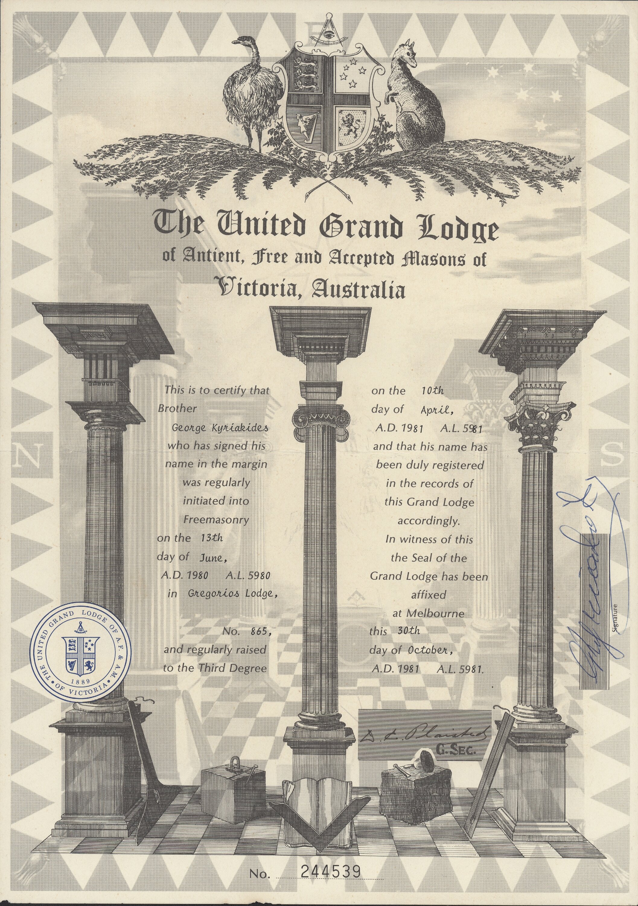 "THE UNITED GRAND LODGE/ of Antient, Free and Accepted Masons of/ Victoria, Australia/ This is to certify that/ Brother/ George Kyriakides/ who has signed his/ name in the margin/ was regularly/ initated into/ Freemasonry/ on the 13th/ day of June/ AD 1980 AL 5980/ in Gregorios Lodge,/ No. 865,/ and regularly raised/ to the Third Degree/ on the 10th/ day of April/ AD 1981 AL 5981/ and that his name has/ been duly registered/ in the records of/ thid Grand Lodge/ accordingly./ In witness of this/ the Seal of the / Grand Lodge has been/ affixed/ at Melbourne/ this 30th/ day of October,/ AD 1981 AL 5981/ No 244539.