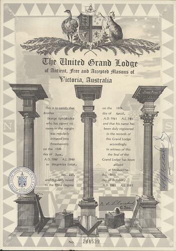 Certificate acknowledging that George Kyriakides has been admitted to the United Grand Lodge of Antient, Free and Accepted Masons of Victoria, Australia. The certificate is dated 30 October 1981, registration number 244539. It also mentions that George was initiated into Free Masonry on 13 June 1980. He was then was raised to the Third Degree on 10 April 1981. This certificate is part of the documentation relating to George Kyriakides, and the successive silversmithing and jewellery businesses in which he was involved.