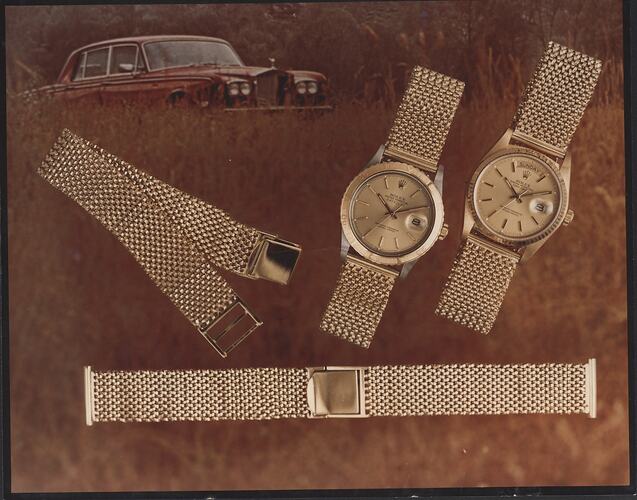 Mock-up of two gold Rolex watches, two gold nonstandard straps and a Rolls Royce car driving through long grass. It appears to be a composite created from two separate images, one of a car driving through grass, and the other of the watches and straps. The car can be identified as a 1979 Rolls Royce Silver Shadow while the watches featured are both Rolex Oyster Perpetual Watches, with one being the 'date-just' model and the other being the 'day-date' model. The straps pictured are custom straps that would have been manufactured as extra alternatives by GK Jewellery. The composite image was created by Emerald Hill Studio, South Melbourne and has their studio name plate sticker on the reverse. The object is part of the collection that details the work of George Kyriakides, and the successive silversmithing and jewellery businesses in which he was involved.