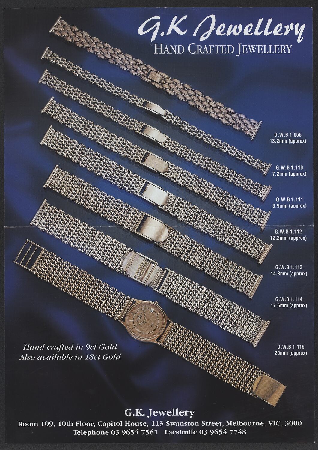 "G.K Jewellery / Hand Crafted Jewellery / G.W.B 1.055/ 13.2mm (approx)/ G.W.B 1.110/ 7.2mm (approx) / G.W.B 1.111 / 9.9mm (approx)/ G.W.B 1.112/ 12.2mm (approx) /G.W.B 1.113/ 14.3mm (approx)/ G.W.B 1.114/ 17.6mm (approx)/ G.W.B 1.115/ 20mm (approx)/ Hand crafted in 9ct Gold/ Also available in 18ct Gold/ G.K Jewellery/ Room 109, 10th Floor, Capitol House, 113 Swanston Street, Melbourne. VIC. 3000/ Telephone 03 9654 7561 Facsimile 03 9654 7748"