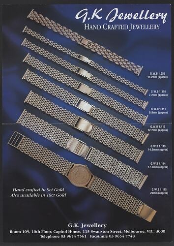 Print advertisement for G. K Jewellery detailing the handcrafted custom watch bands G. K Jewellery made to fit name brand watches. It features eight examples of custom bands in varying sizes, colours and finishes. One of the custom watch straps is displayed attached to a Christian Bernard men's watch face. The images of the watch and bands are overlaid onto a photograph of a navy blue satin fabric background to create a composite image. The advertisement is part of the documentation relating to George Kyriakides, and the successive silversmithing and jewellery businesses in which he was involved.