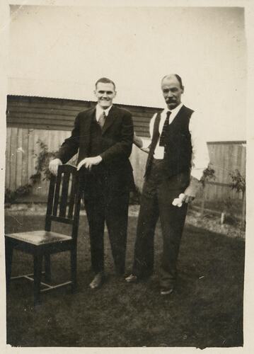 Digital copy of photograph of World War I veteran Bernard Haines with another man. Bernard is holding onto a chair. It is the same setting as shown in MM 144043.