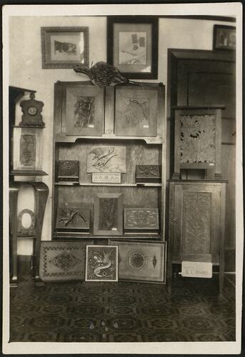 Digital copy of photograph of World War I veteran Bernard Haines' wood carvings.